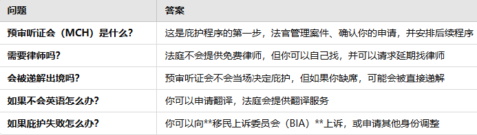 预审听证会通常很短(5-10分钟),你不需要详细说明你的庇护理由,法官不会当场做出裁决。