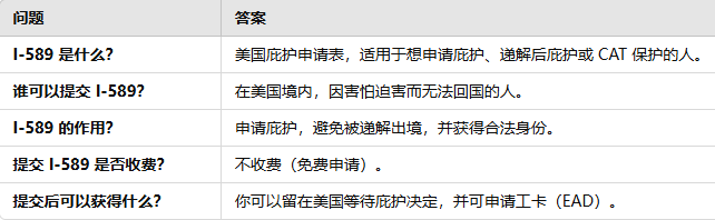I-589《庇护申请和递解禁令(Withholding of Removal)申请表》 是美国庇护申请的官方表格。所有想要申请庇护(Asylum)、递解后庇护(Withholding of Removal)或反酷刑公约保护(CAT Protection) 的人,都必须填写和提交 I-589 表格。