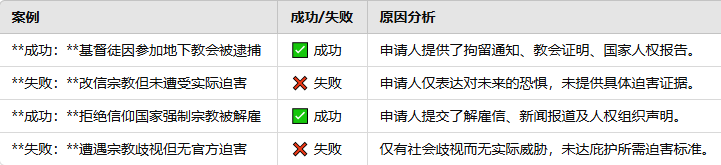 - 受保护身份:申请人必须有明确的宗教身份,或因拒绝信仰而面临迫害。