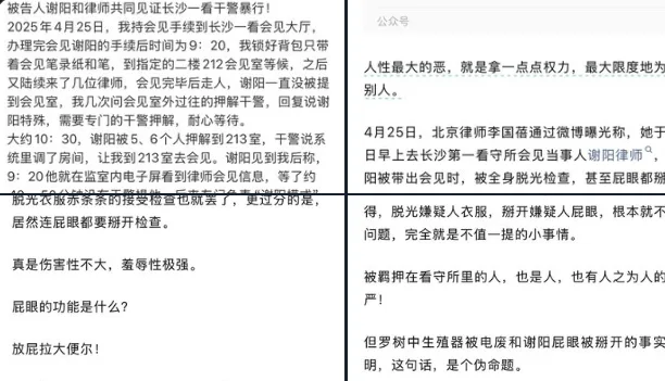 唐人日报4月27日讯:北京律师李国蓓在微博发文披露,当天早上,她前往长沙第一看守所会见当事人谢阳律师,谢阳在被带出会见前,遭遇了极端羞辱性的全裸检查,包括被强行掰开肛门检查。尽管深感屈辱,谢阳为了能见到律师,只能被迫接受。