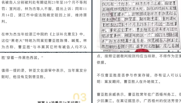 令人震惊的是,该案中的“黑老大”林为杰及多名团伙成员均表示不认识曹亚胜,未见其参与作案;部分被害人也出具声明,证明案发时曹亚胜并不在现场。一名被害人直言,因遭警方“恐吓”才被迫指证曹亚胜。然而,廉江市法院仍采信了两名证人存在重大瑕疵的口供,将曹亚胜定罪。