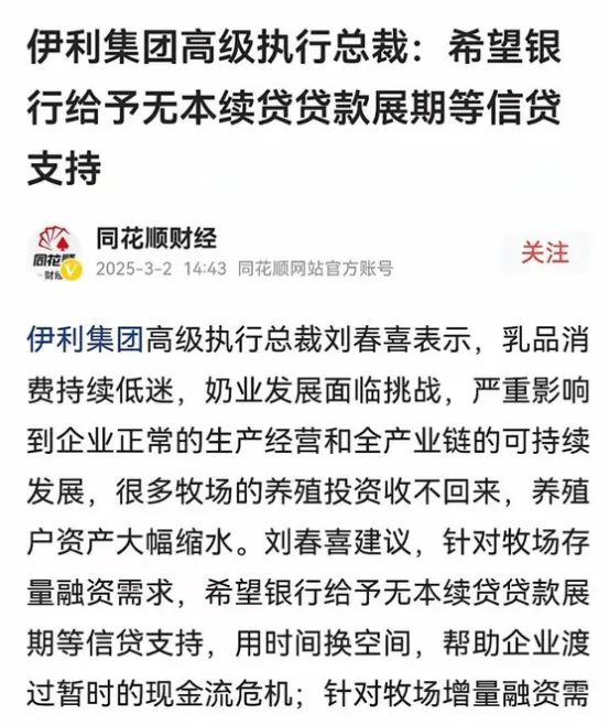 刘春喜进一步说明,伊利集团作为中国乳业的龙头企业,长期致力于提升产业链的综合竞争力和创新能力,然而目前市场的不景气已对企业及合作伙伴造成了显著的财务压力。在这种形势下,刘春喜向相关银行提出了特别的呼吁,希望能够获得更多的金融支持,特别是无本续贷和贷款展期等信贷措施。