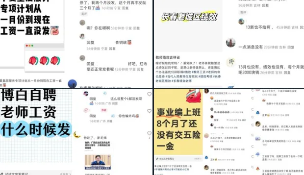 唐人日报5月16日讯:近日,多地网友密集曝光体制内欠薪、断缴社保等现象,引发舆论高度关注。5月15日,宁夏一名参与“基层服务专项计划”的人员称,从今年1月起至今工资分文未发,生活难以为继;同日,吉林长春网友也反映,当地老城区教师年终绩效一直未发,毫无进展。
