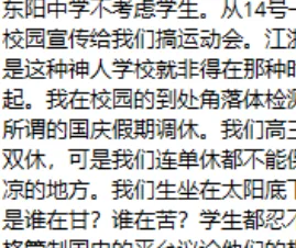 唐人日报10月10日讯:一则来自东阳中学学生的匿名控诉在网络上引发热议。帖子中,这名高三学生以近乎崩溃的语气写道:“我们从14号连读到今天30号,为了学校的宣传被逼着参加运动会。江浙沪的中午十二点,烈日暴晒下,我们被迫坐在操场上听领导讲话,他们却坐在阴凉处。”