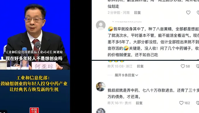 然而,何亚琼的这一提议在网上引发了激烈的讨论。许多网民在评论区表达了对中药行业投资的负面看法。部分人表示,自己曾尝试投资中药产业,但最终亏得“裤衩都不剩”。他们认为,中药产业存在一定的市场风险和不确定性,尤其是由于行业的竞争激烈和技术壁垒较高,许多初入者最终未能获得预期的回报。