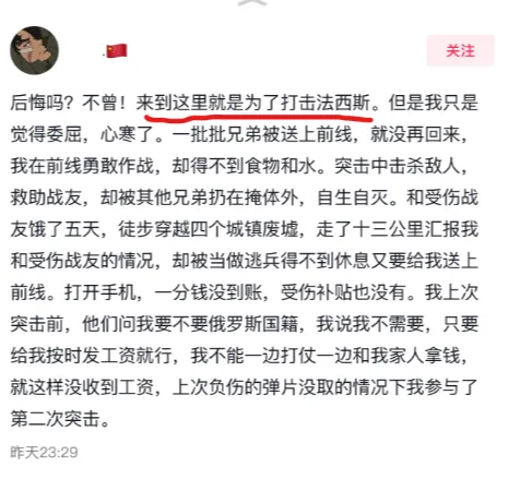 今年,为了打击法西斯,怀着满腔热血来俄国参军的中国籍士兵“蟋蟀”在直播中诉苦称,来了以后才发现我们都是炮灰,并且俄国政府还拖欠工资,承诺的月薪25万,实际只有几万卢布,没有杀敌和受伤补贴。 目前,营里只剩下自己一个中国雇佣兵,所处的战线9月份和10月份共死了6个中国人。