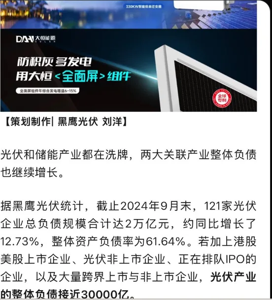 唐人日报2月27日讯:近日,根据媒体报道,截至去年9月末,光伏产业和储能产业的整体存储规模均接近3万亿元。光伏行业中,121家上市企业中有39家企业的总存储规模超过100亿元。储能产业方面,169家上市企业中,51家企业的存储规模也突破100亿元。