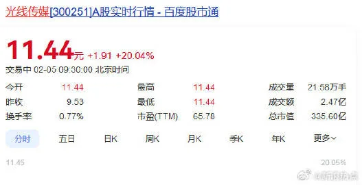 唐人日报2月5日讯:近日,光线传媒出品发行的电影《哪吒之魔童闹海》表现抢眼,成功夺得春节档票房冠军。凭借强大的票房号召力,该影片不仅获得观众好评,也带动了光线传媒股价的上涨。1月31日,光线传媒股票迎来了20%的涨停,成为市场关注焦点。