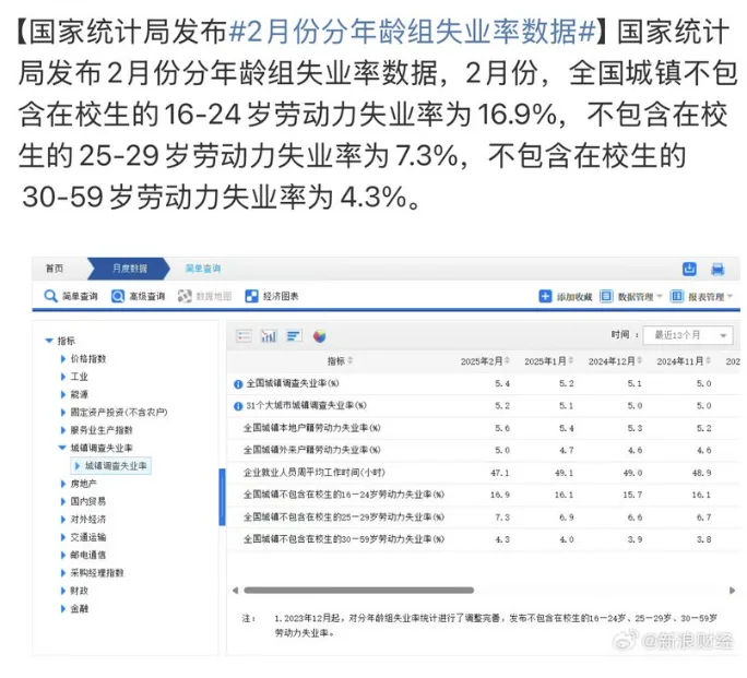 根据统计局公布的数据,16至24岁的城镇人口失业率从1月的16.1%上升至2月的16.9%。这一年龄段的失业率持续处于较高水平,反映出刚进入劳动力市场的年轻人面临较大的就业困难。同时,25至29岁人群的失业率也出现上升,从1月的6.9%升至2月的7.3%,创下15个月以来的新高。