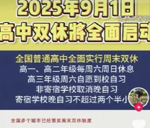 唐人日报9月19日讯:江苏一位网友在网络上转发了一则通知,称自2025年9月1日起,全国普通高中将全面实行周末双休制度。根据通知,高一、高二年级学生每周六、周日正常休息;高三年级学生则可在周六“自愿”返校自习。同时,非寄宿制学校将取消晚自习,而寄宿制学校的晚自习时间不得超过两个半小时。这一消息迅速引爆网络,评论区却并非一片叫好,而是涌现出大量不同地区网友的共同困惑:“你的中国,我的中国好像不一样。”