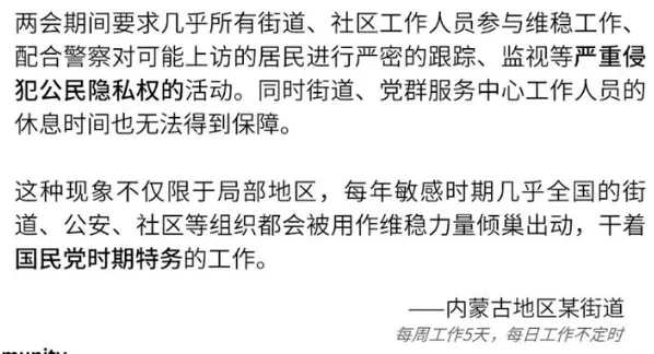 投稿中提到,这种做法不仅局限于某一地区,而是在全国范围内普遍存在。每年在政治敏感时期,如两会,公安、街道和社区等组织都被动员起来,执行类似于国民党时代特务所进行的维稳任务。