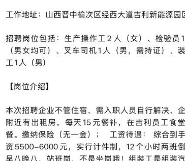 唐人日报10月22日讯:近日,一则来自山西的招聘启事在网络上引发热议。招聘方是一家吉利汽车供应链企业,正在招募5名普通工人。招聘公告写得直白甚至“赤裸”:实行“007”工作制,即早7点到晚7点、全年无休;两班倒、12小时制,并特意注明——“站班岗,不是坐班岗”。