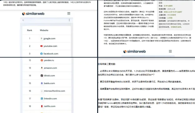 这一隔绝态势不仅是物理层面的网络屏蔽,更在信息流通与认知结构上筑起一道“数字柏林墙”。数据显示,在全球60%的互联网内容由英语世界产出时,中文内容仅占1.3%。这一极端失衡的比例揭示了中文网民所处的认知局限:即便身处信息时代,每个人却被牢牢锁定在经过国家审查、平台算法、社交圈层三重过滤的信息茧房中。