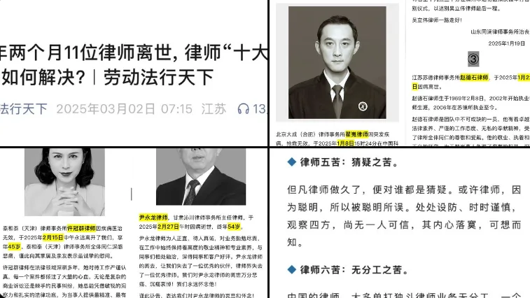 唐人日报3月7日讯:近日,微信公众号“劳动法行天下”发布了一篇引起广泛关注的文章,披露了2025年以来,短短两个月内已有11名律师在中国意外离世,年龄介于39岁至54岁之间。这些律师的离世原因多样,包括突发疾病、车祸和心脏病发作等。