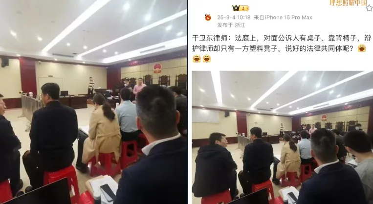 唐人日报3月5日讯:近日,在中国法庭上的设施配置问题引发了新一轮的社会关注。新疆的干卫东律师在其最近的一次法庭辩护中指出,存在于法庭内部的设施不平等现象,突显了公诉人与辩护律师之间的待遇差异。据他描述,在具体案件审理过程中,公诉人拥有桌子和靠背椅,而辩护律师仅被提供了一方塑料凳子。