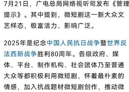 唐人日报7月23日讯:国家广播电视总局发布最新通知,明确要求各类抗战题材影视作品严禁出现“奇功”“神技”等违背历史常识的内容,坚决摒弃“我方超人化、敌方弱智化”的幼稚化叙事方式。这一举措意在全面整治近年来泛滥的“抗战神剧”乱象,提升影视作品的思想性与历史厚重感。