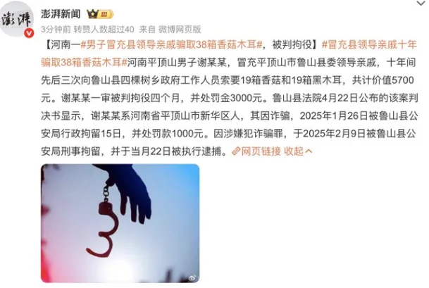 唐人日报4月24日讯:近日,平顶山鲁山县一则离奇案件引发网友热议。谢某某因十年来冒充“领导亲戚”身份,三次向鲁山县四棵树乡政府工作人员索要香菇和黑木耳共计38箱,被法院以诈骗罪判处拘役四个月,并处罚金3000元。