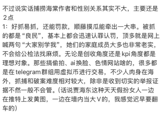 相比之下,真正涉足境外网络黑产的团伙隐蔽性强、抓捕难度大、案件侦破周期长,且不易形成短期成果,因此相关打击往往力度有限。相对而言,打击“海棠作者”可迅速结案、罚款到位、KPI数据亮眼,成为某些执法部门“理想目标”。