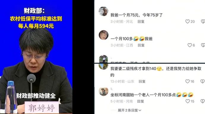 唐人日报3月2日讯:近日,中国财政部公布的数据显示,截至去年年底,全国农村低保的平均标准已达到每人每月594元。然而,这一消息一经发布,即在社交媒体上引起了广泛讨论和争议。不少网友在评论区表达了疑问,称他们的家庭成员每月领取的养老金仅为一百元左右,远低于官方公布的平均标准。