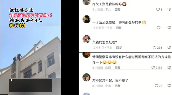 唐人日报2月13日讯:近日,杭州城厢街道4名农民工因讨薪问题跳楼,结果遭公安行政拘留一事引发了广泛关注。网民纷纷质疑,欠薪者为何不受应有处罚,反倒是苦苦讨薪的工人被拘留。“为什么欠薪合理?”“欠工资的人怎么处理?”“请问警察同志,有没有既能讨到薪,又不犯法的方法?”成了网友关注的焦点。