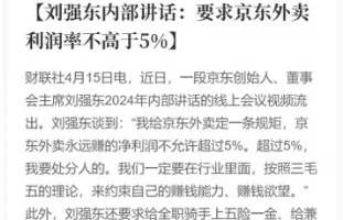 刘强东内部讲话视频流出:京东外卖净利不得超5% 强调保障骑手权益