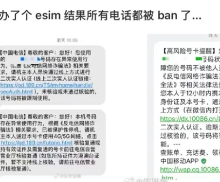 唐人日报10月30日讯:“办个eSIM怎么这么难”登上微博热搜,引发全国用户热议。多位网友反映,在办理eSIM业务后,原有电话功能突然被全面限制,接打电话、收发短信均无法使用,紧接着还收到来自中国电信或中国移动的“高风险卡号提醒”短信,要求用户携带身份证及手机号前往营业厅或通过线上渠道完成二次实名认证。