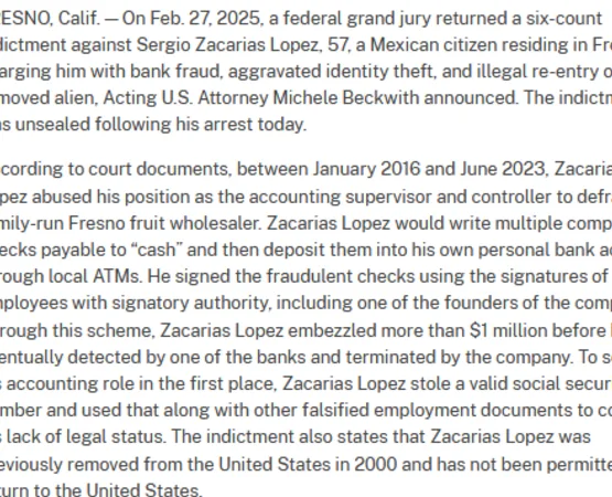 唐人日报5月12日讯:加州弗雷斯诺县检方日前正式起诉非法移民塞尔吉奥·扎卡里亚斯·洛佩兹(Sergio Zacarias Lopez),指控其涉嫌银行欺诈、严重身份盗窃,以及非法再入境美国等多项重罪。案件涉及金额超过一百万美元,震动当地商界。