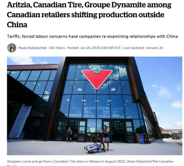 唐人日报1月25日讯:近日,特朗普威胁对中国商品征收额外关税,引发加拿大零售商将生产线转移至中国以外地区。服装零售商Groupe Dynamite首席执行官卢特菲表示,公司已采取措施,将更多生产线迁出中国。制鞋商Steve Madden原计划减少10%中国制造商品,现目标为40%。时尚品牌Lululemon则透露,其在中国的业务已非常有限。