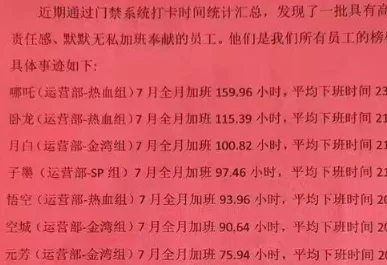 据通报显示,该公司运营部“热血组”员工“哪吒”,在2025年7月全月加班高达159.96小时,平均每日下班时间为晚11:12。其他被表扬的员工也普遍加班超过70小时,平均下班时间集中在晚上8点至10点之间。其中,“卧龙”115小时、“月自”100小时、“悟空”93小时,“子墨”“玄霄”“果冻”等十余人加班均超过60小时。