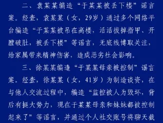 与此同时,警方还对另一部分网络传言展开查处,包括“于某某被人从窗口推下”“于某某坠楼前遭虐待”“于某某母亲被经纪公司暴力驱赶”等消息,均被认定为虚假信息。相关责任人已依法受到处理。