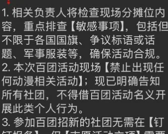 据多名学生透露,校方在活动筹备会上明确要求,各社团的宣传展示须“符合主流价值导向”,不得出现“与动漫、二次元相关的内容、图像或表演”。这意味着,无论是角色扮演(Cosplay)、动画作品展示,还是以ACG为主题的文化社团,都被排除在本次正式招新活动之外。