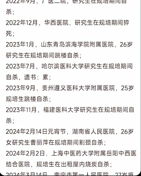 唐人日报1月27日讯:近年来,医学生自杀事件频繁曝光。据不完全统计,2017年到2024年3月期间,医学生自杀案件屡见不鲜。由于学业压力大、心理负担重以及长时间的临床实习等因素,越来越多的医学生承受着巨大的身心压力。心理健康问题成为医学生群体的隐患,部分学生因难以应对高强度的学业任务和情感困扰,最终选择了极端的方式。