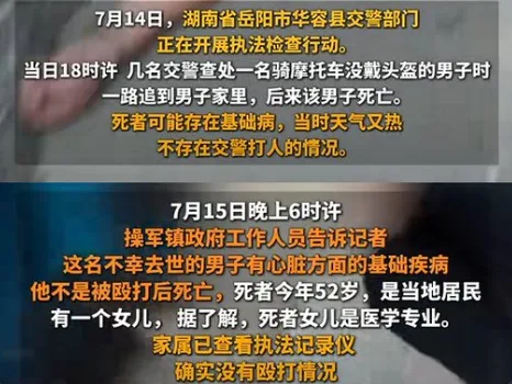 唐人日报7月17日讯:湖南岳阳华容县一男子因未戴头盔被交警追逐,最终在家中死亡的事件引发舆论关注。网传视频称,多名交警将男子追至家中,涉嫌暴力执法致死。对此,当地政府回应称,死者患有心脏方面的基础疾病,当天高温酷热,死亡并非因殴打所致。