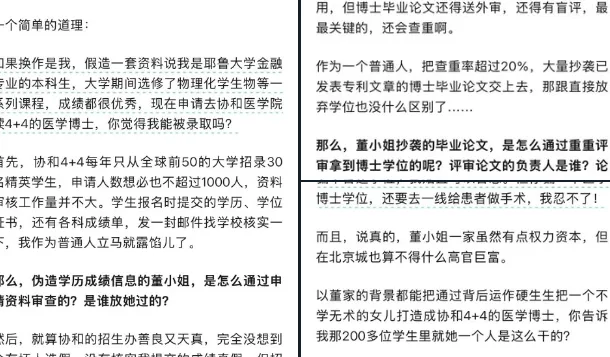 更令人费解的是,协和4+4项目设有严格面试环节,董袭莹凭借完全伪造的学术记录竟能顺利通过?是哪些评委对其做出肯定评价?为何未能识破其基本专业素养的缺失?