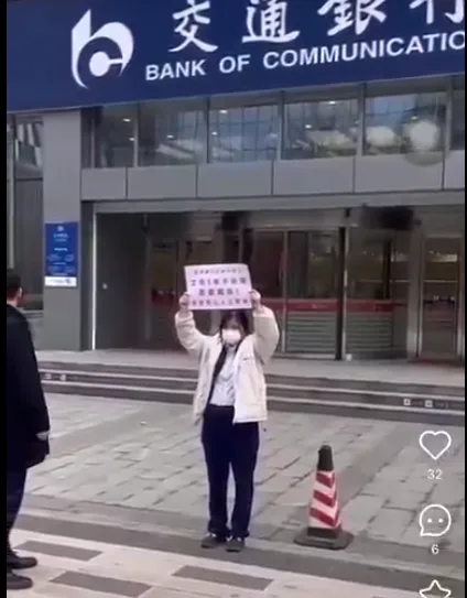 唐人日报1月24日讯:近日,江苏南京,交通银行南京分中心的部分员工举起标语,公开抗议公司违法裁员。抗议者表示,公司未遵循相关劳动法律程序,实施裁员决定未与员工进行充分沟通,也未给予应有的经济补偿。举标语的员工要求公司撤回裁员决定,并依法履行应尽的责任。