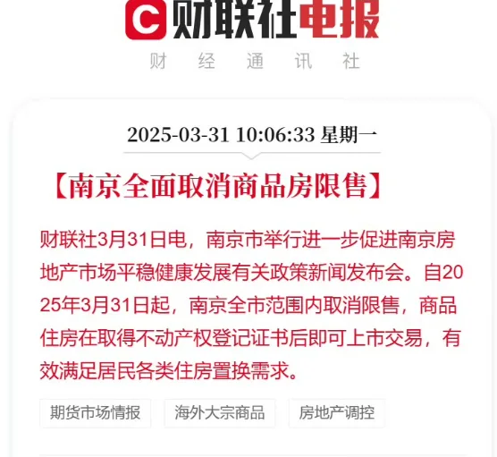 唐人日报4月2日讯:近日,南京市官方宣布全面取消商品房限售政策,标志着对房地产市场的一大调控措施正式解除。此举旨在刺激房地产市场,提高流动性,同时也引发了广泛的市场和社会反响。