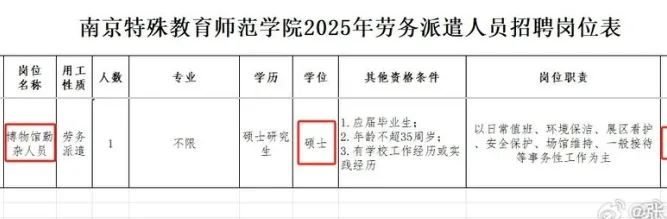 唐人日报3月6日讯:近日,南京特殊教育师范学院艺术学院发布勤杂人员招聘启事,引发了广泛关注和讨论。该职位要求应聘者具有本科或研究生学历,工作性质为劳务派遣,主要职责包括环境保洁和保护等。此一职位设置及其学历要求在社会上引起了一定的争议,许多人质疑为何如此基础的工作需要如此高的学历要求。