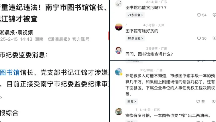 唐人日报2月16日讯:近日,南宁市纪监委通报,南宁市图书馆馆长江锦才因涉嫌严重违纪违法正接受调查。此消息引发了公众的广泛关注与讨论,不少网友对此表示震惊,称“图书馆也能贪污吗”以及“果然,书中自有黄金屋”。此事件再次凸显了公共部门内部管理的严峻性和反腐败斗争的重要性。