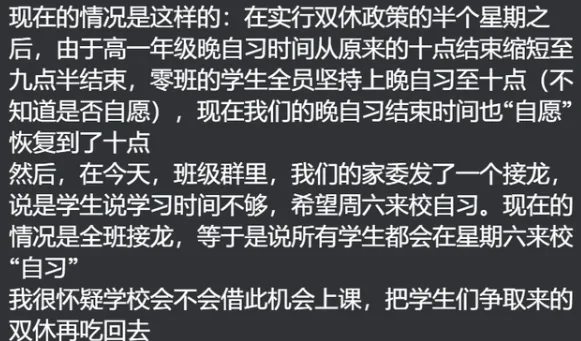 江科附中学生向Up主反映,虽然官方宣称晚自习“自愿”,但实际上学校已要求全班“接龙报名”,并将晚自习恢复至晚十点,甚至“自愿”在每周六返校“自习”,名为自由选择,实为强制执行。