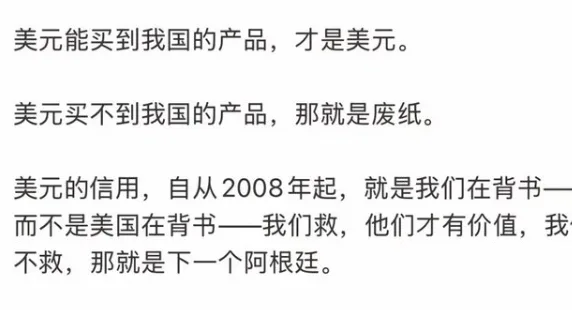 唐人日报4月18日讯:近日,知名“正能量”网络博主崔紫剑在社交平台发布一则言论,引发舆论热议。他在文章中声称:“美元的信用,自从2008年起,就是我们在背书——不是美国在背书。我们救,他们才有价值;我们不救,那就是下一个阿根廷。如果我们弃用美元,美元就是废纸一张。”