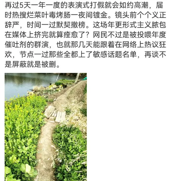 唐人日报3月13日讯:近日,一名博主对正在进行的两会进行了尖锐的评论,批评代表们在镜头前表现义正词严,而会后迅速撤榜,暗示这种行为体现了形式主义的问题。博主在其帖子中指出,这种年度政治仪式在媒体的包装下似乎迅速“痊愈”,而普通网民则如同被投喂了“年度催吐剂”的群演,只能在网络上短暂热议。