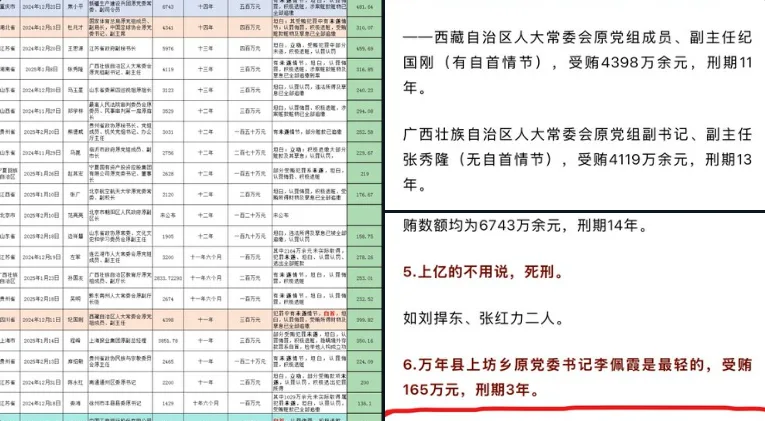 唐人日报2月26日讯:近日,博主“瑞京”通过分析近一年贪官案例,归纳了判刑期与贿赂金额的关系。他总结道,贿赂金额每增加一千至三千万元,判刑期大致在十一至十三年之间;四千至六千万元则是十四至十五年,而一百多万元的案件则通常判三年起步。