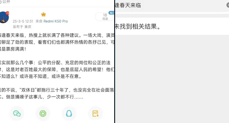 唐人日报3月9日讯:近日,一位博主在微博上发表了对中国两会的评价,称每逢春天,热搜便会充斥着各种政策建议,形容这一切如同一场精心编排的戏剧,而参与者们都在尽力表演。博主指出,尽管话题多样,但核心问题始终围绕着公平分配、岗位供给和法律公正等几个方面。他还特别提到,即便是实施了三十年的“双休日”政策,也未能完全落到实处。