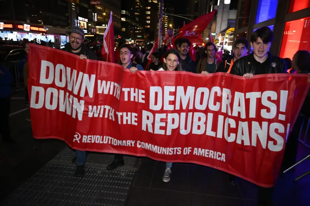 示威者手持标语,要求“自由巴勒斯坦”,并拒绝支持任何一方候选人。