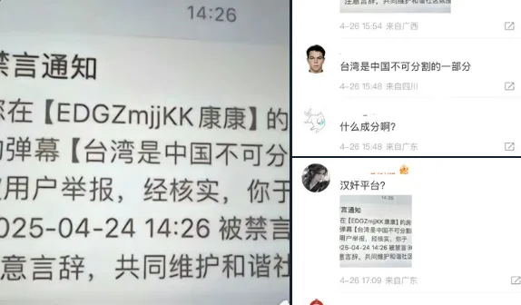 唐人日报4月27日讯:有网友曝光,在虎牙直播平台发送弹幕“台湾是中国不可分割的一部分”后,竟被平台禁言长达365天。