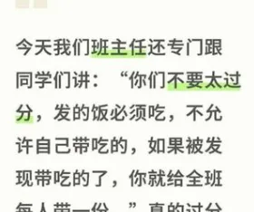 据家长透露,学校实行统一配餐制度,学生每天的午餐由学校食堂供应。然而,一些孩子因口味或饮食习惯原因,会选择自带饭菜。对此,班主任却以“连坐”的方式加以限制,不仅要求学生必须吃完食堂饭菜,还威胁如果有人带饭,就要承担为全班同学“请客”的惩罚。