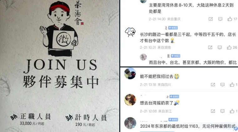 唐人日报2月22日讯:近日,台中一家奶茶店发布的招聘信息显示,正式员工月薪为33000元新台币(约7300元人民币),兼职薪资为190元新台币(约42元人民币)每小时。然而,重庆另一奶茶店对咨询的大学生表示兼职工资为8元人民币每小时。