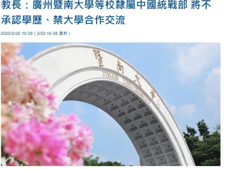 唐人日报2月21日讯:近日,台湾教育部长郑英耀表示,中国的华侨大学、广州暨南大学和北京华文学院目前隶属于中国统战部。教育部已通知台湾高校,禁止与这些统战部直属的学校进行合作交流,包括姊妹校合作。若学校违反规定,教育部将采取处罚措施,包括扣减奖补助款,并且未来不再承认其学历。
