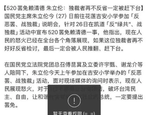 中天新闻随后在微博分享了朱立伦的相关发言,引发大量网友关注与热议。然而,该篇报道很快遭到删除,未给出具体解释。