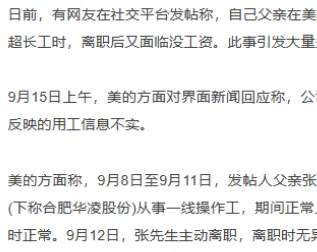 合肥美的回应“加班欠薪”指控:网传不实,发帖人已删帖道歉